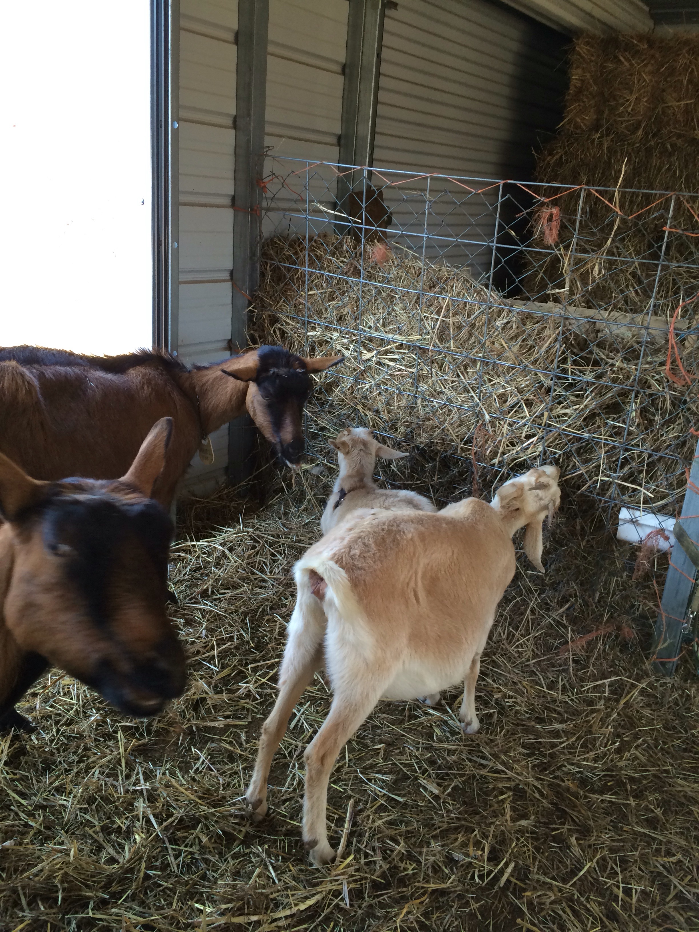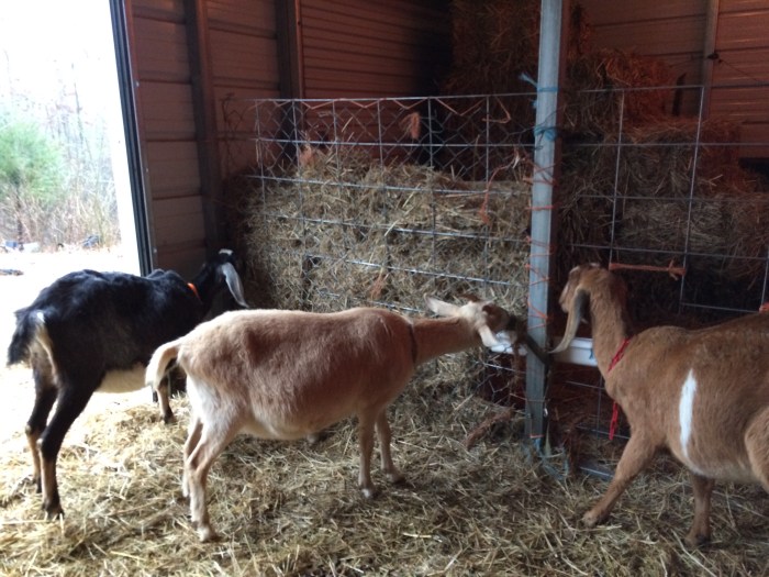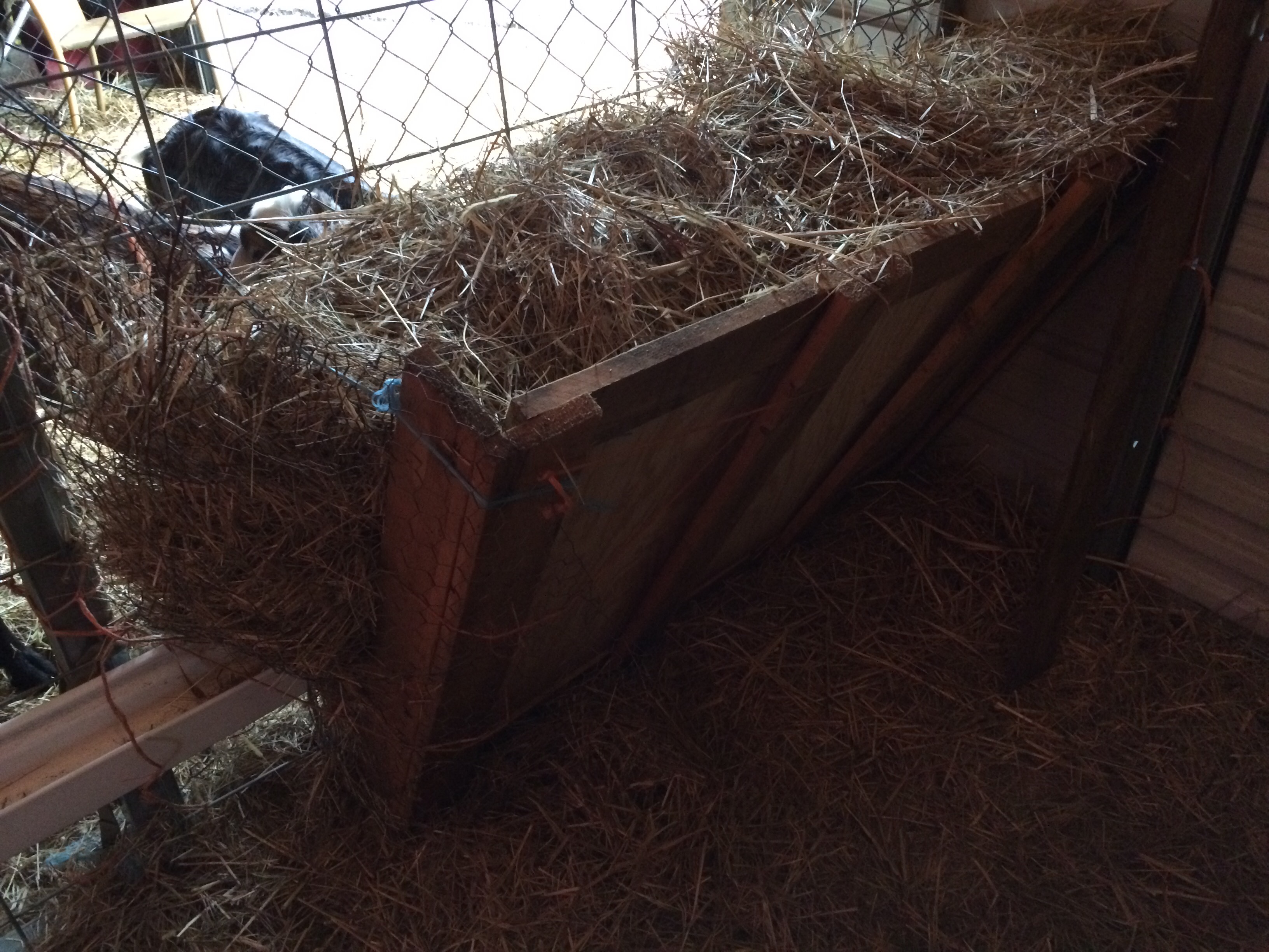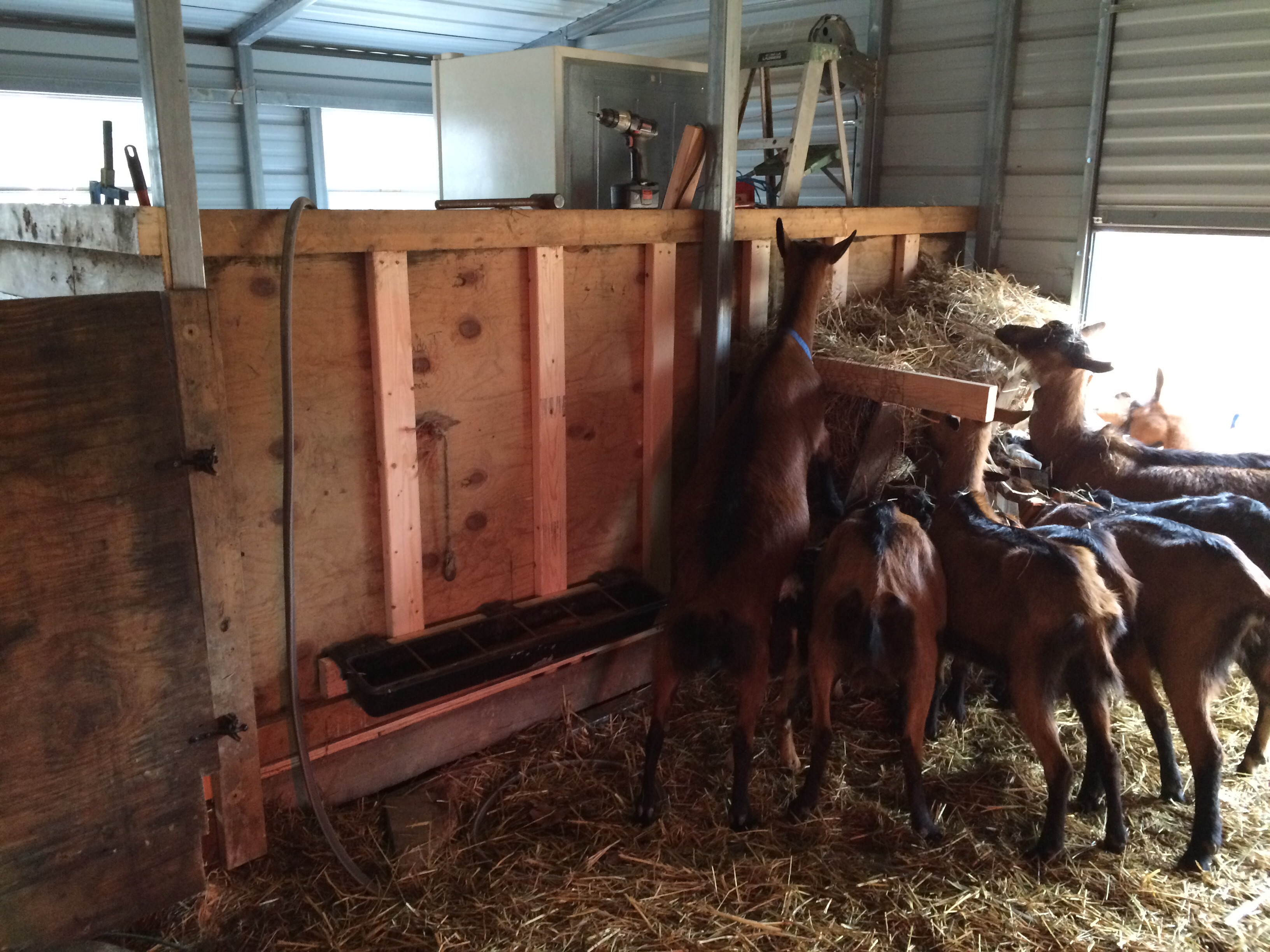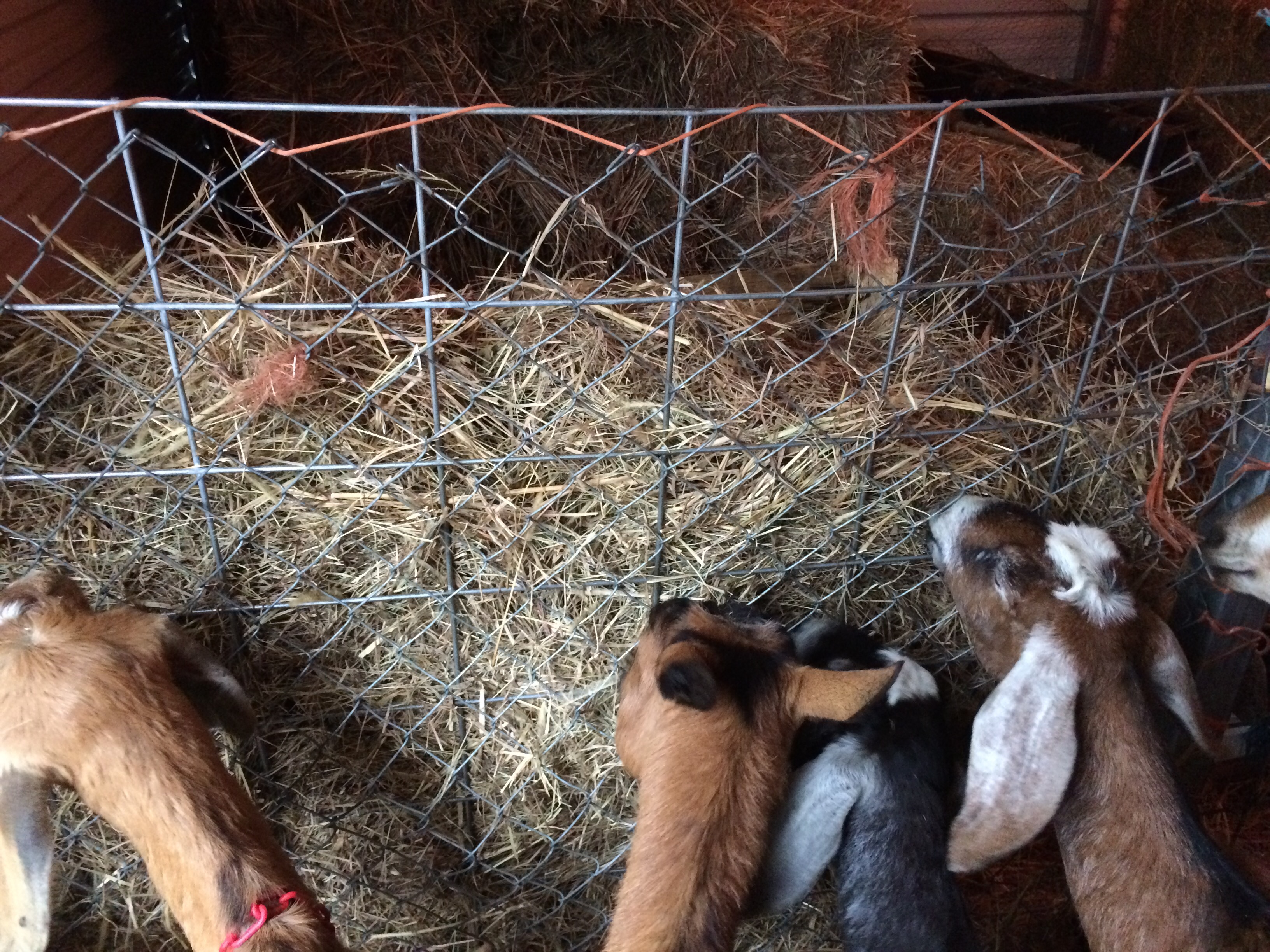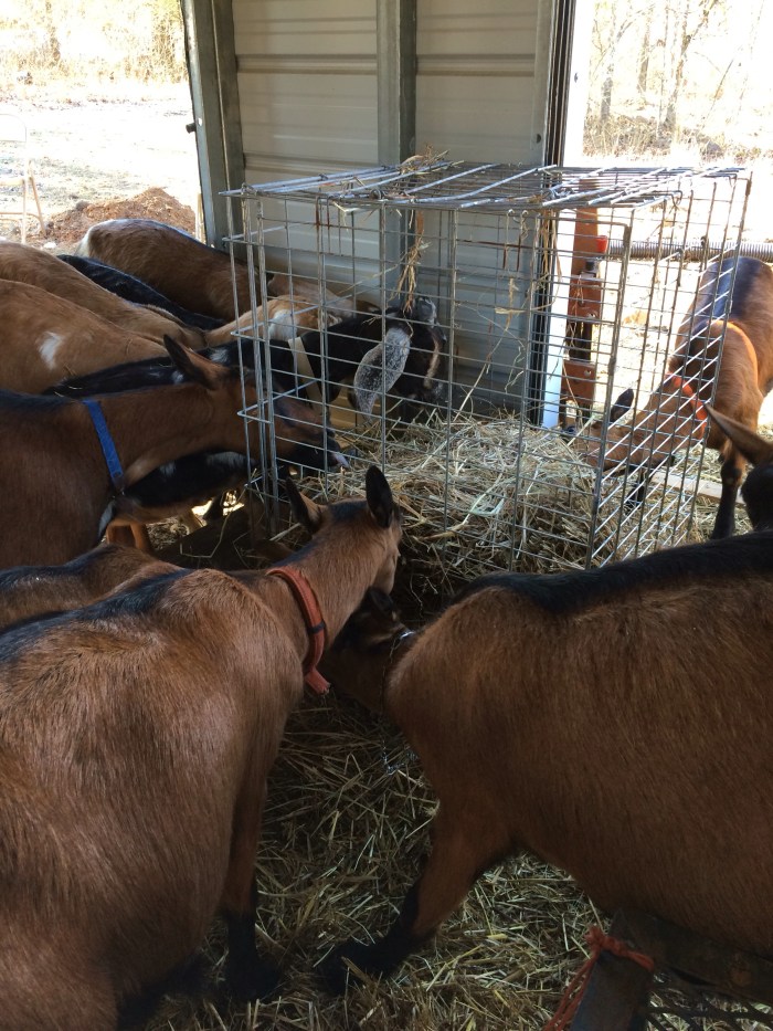 Also, I discovered the oberhasli girls weren’t allowing anyone else to eat at the hay feeder except Dora, so I quickly made one from a dog kennel. That they all fought over and ignored the actual feeder.