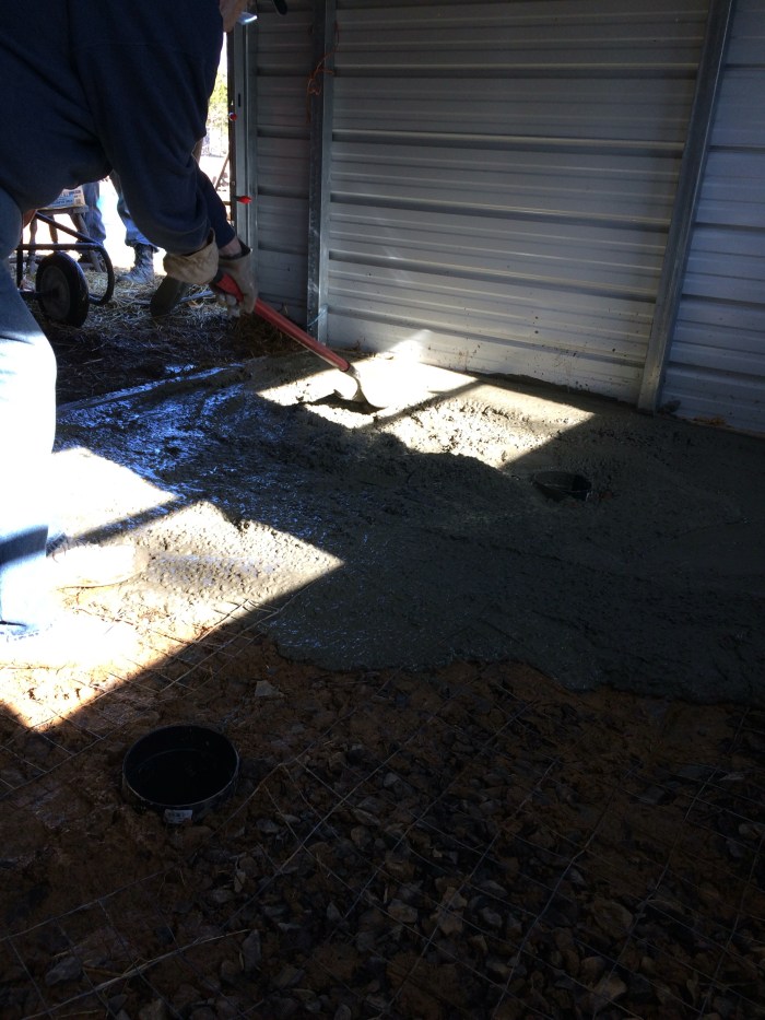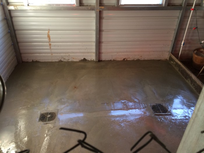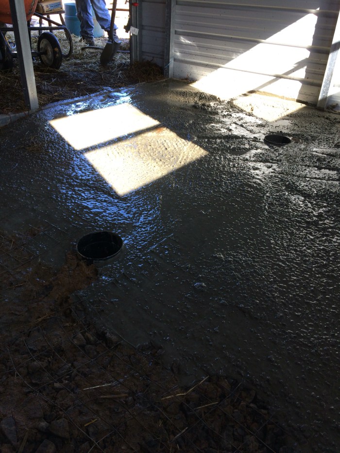 Beautiful cement floors with goat kid safe drains. 30 bags of quikcrete total. It will probably take a week or so to completely cure in these cold temps. Which is fine, because next we start on the milking room itself!