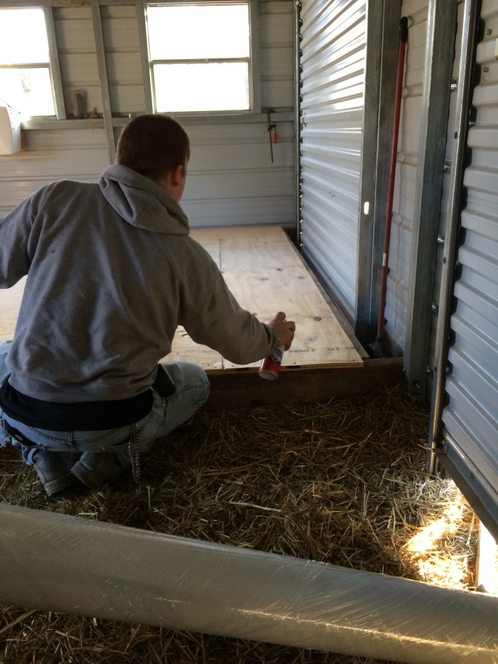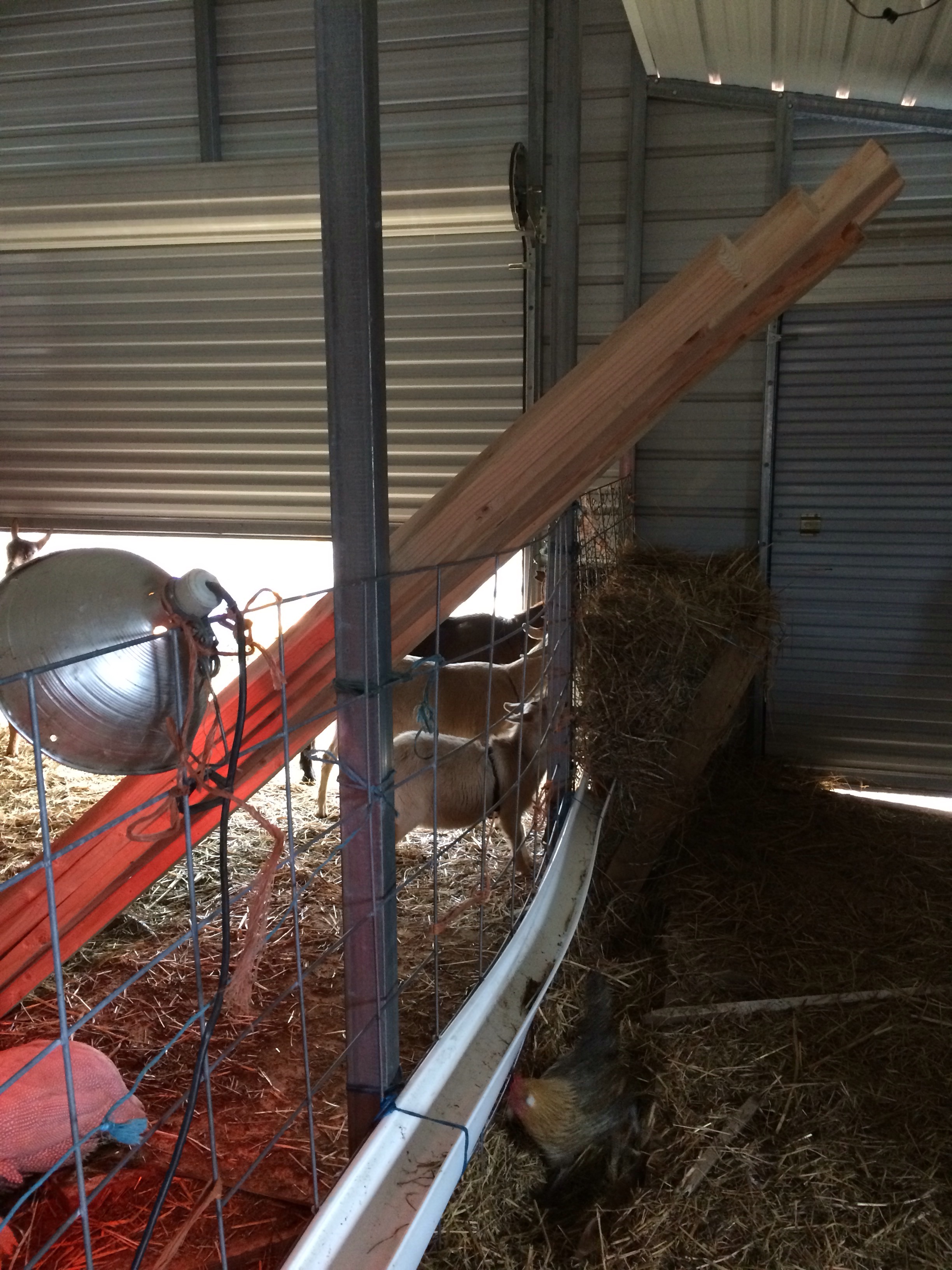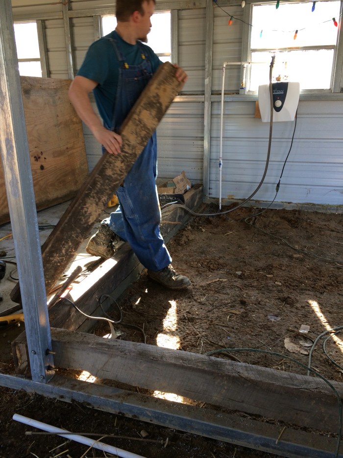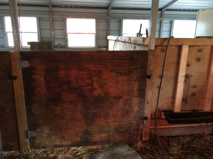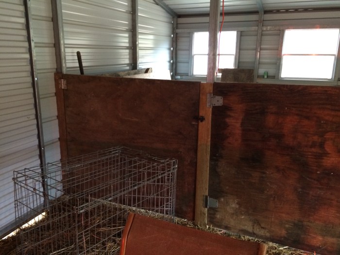 Joshua has reused the old stalls from the first barn to create the base walls for the milk room, and we also got the stall doors in place. We’ve decided to use a cattle panel to divide them. It allows the kidding does to see each other, and will eventually allow for one large baby pen for feeding time.